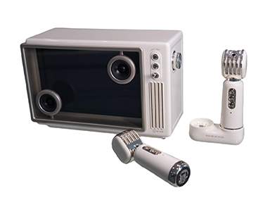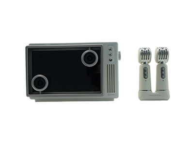 Simple light retro design with clear appearance design.Equipped with two compact microphones of the same color and a microphone charging station.Equipped with three speakers and two bass radiators.